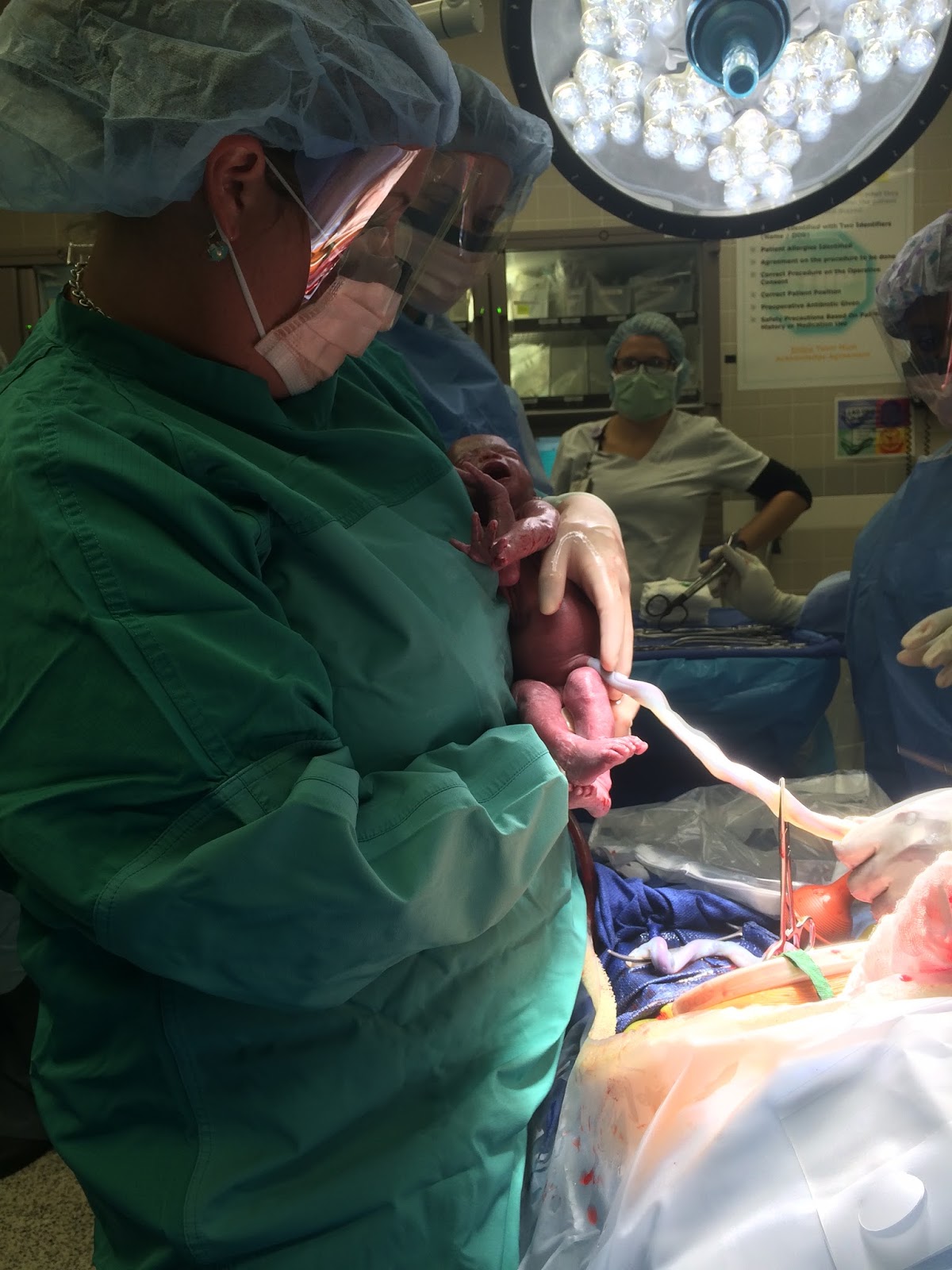 Some things I was really thankful for was that the attending doctor who did the surgery knew Ryan from when he was in med school. It always feels nice to have a connection. Dr. Sutton also had a very calming presence and a confidence about her. The anesthesiologist and nurse anesthetist were super- very confident, slightly humorous, and they did a great job of keeping me calm. Because things happened so fast I had little time to worry. When I got wheeled into the OR I was very overwhelmed with the amount of people in there. Each baby had their own isolate and each had their very own NICU team, probably 5 people per team. I had two nurses assigned to me, a resident, an attending, a med student, the anesthesiologist and anesthetist, and who knows who else! I remember thinking it was about 20 people in the OR. The two teams waiting for the babies is what really got to me. It was so nerve wracking yet comforting to know they had so many people to care for them right after being born. One of my biggest praises from the day they were born was that we were able to get to Greenville in time. Knowing that the babies were so early but would have the specialized care they would need was very comforting. They started the surgery and I kept saying, "Please don't forget my husband!" Thankfully Ryan finally showed up.